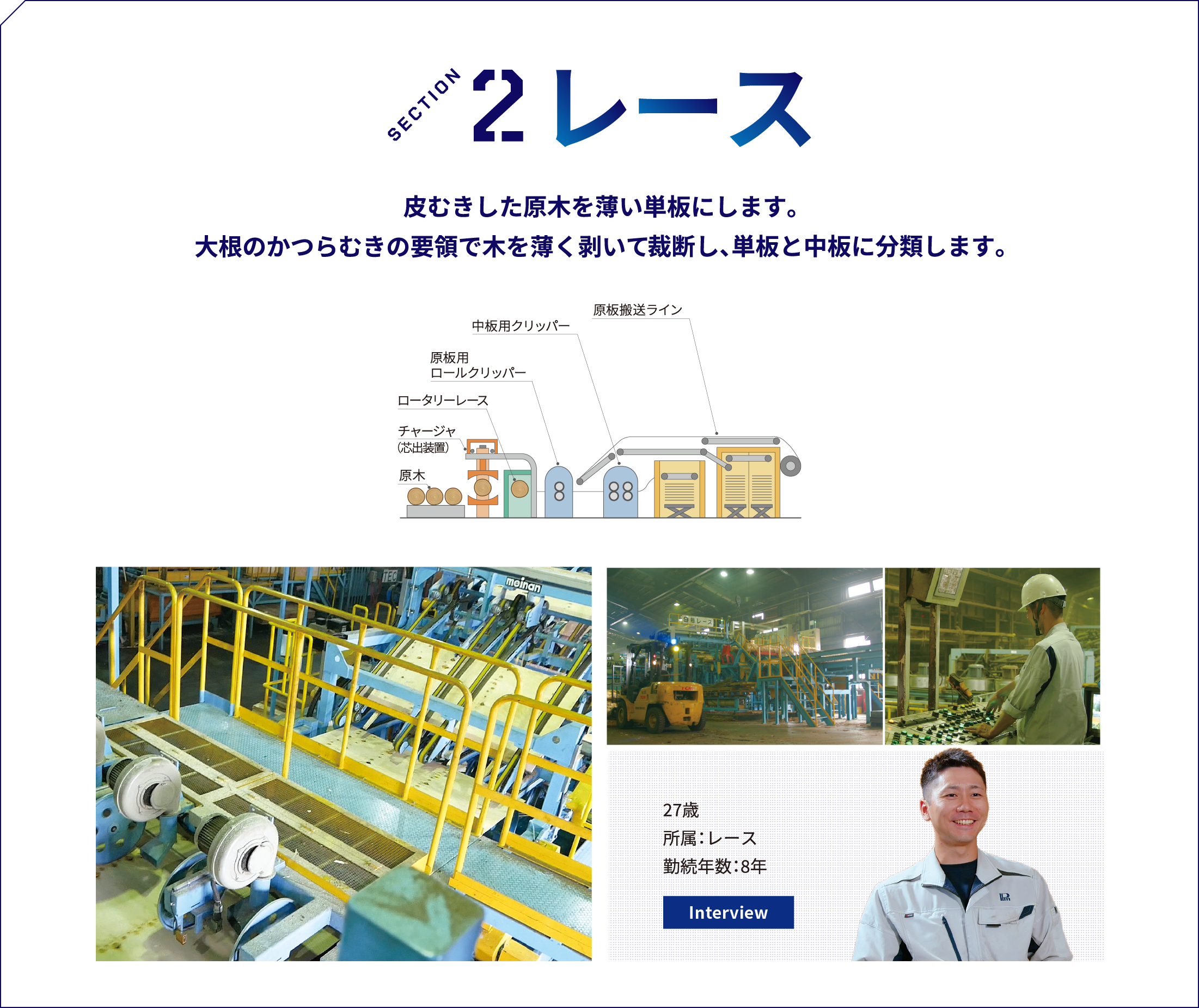 A.原木を大根のかつらむきのような形にして、単板と中板に切り替え、それを見極める作業になっています。