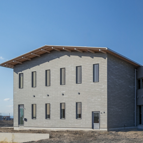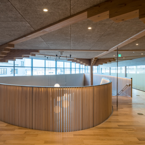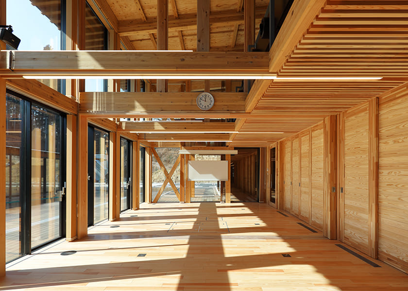 柱や梁にも同市産の杉材を使用し、一般流通材を重ね合わせ大空間を構成することにこだわった建物です。
